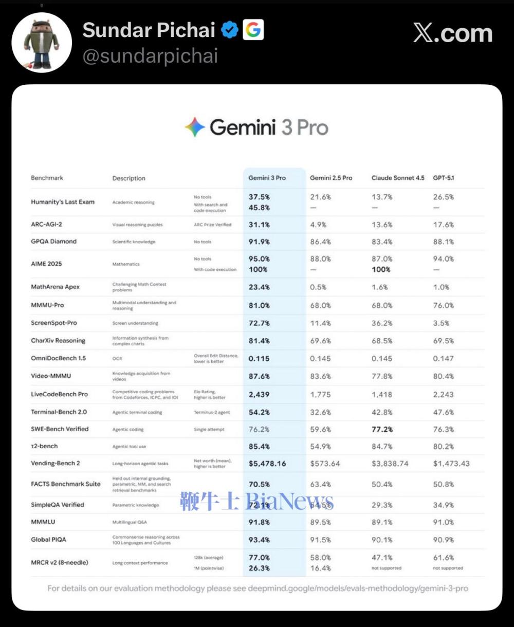 今天凌晨皮查伊发了条帖子,内容唯唯一张图,但这张图充足有劝服力,Gemini 3 Pro险些“屠榜”,在总共主要竞技场名次榜上排名第一。