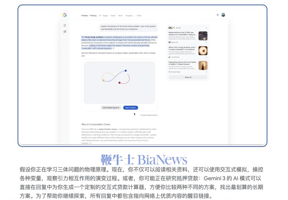 这意味着,新发布的模子也曾充足老到,能在交易化的场景中应用。官方示意,Gemini 3为搜索引擎带来了很强的推明智商,还解锁了新的生成UI体验,用户不错使用有利生成的交互式器具和模拟来赢得动态视觉布局。