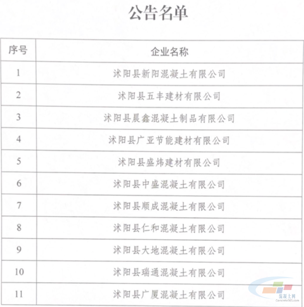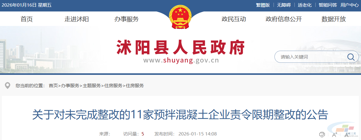 1月15日,江苏省沐阳县东谈主民政府网站发布对于对未完成整改的11家预拌混凝土企业责令限期整改的公告。
